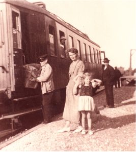 Randers-Hadsund jernbane 1950 Fra venstre: Anders Kusk, Aage Olesen, Kristian Frederiksen. Yderst til højre: baneformand Peter Nielsen